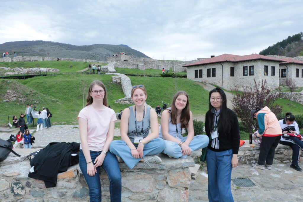 Après cette parenthèse rocambolesque, nous entamons la montée vers la forteresse de Prizren. C’est haut, ça grimpe, mais la vue en haut en vaut largement la peine. Et surtout, les appareils photo s’activent. Margot immortalise l’équipe norvégienne en compagnie de Camille, quand plus tôt un autre groupe – l’équipe irlandaise – demandait à Auriane de les prendre en photo devant le paysage. Les photographes officiels de l’EGMO s’en mêlent à leur tour, filmant pendant plusieurs minutes Auriane en pleine séance photo de l’équipe française – avec consigne de ne surtout pas bouger ! – puis les filles elles-mêmes pendant qu’elles posent. Camille, quant à elle, ne rate jamais une occasion : dès qu’Auriane pointe son appareil vers le paysage, elle surgit pile devant l’objectif… enchaînant les poses les plus spectaculaires. Mention spéciale bien méritée !
