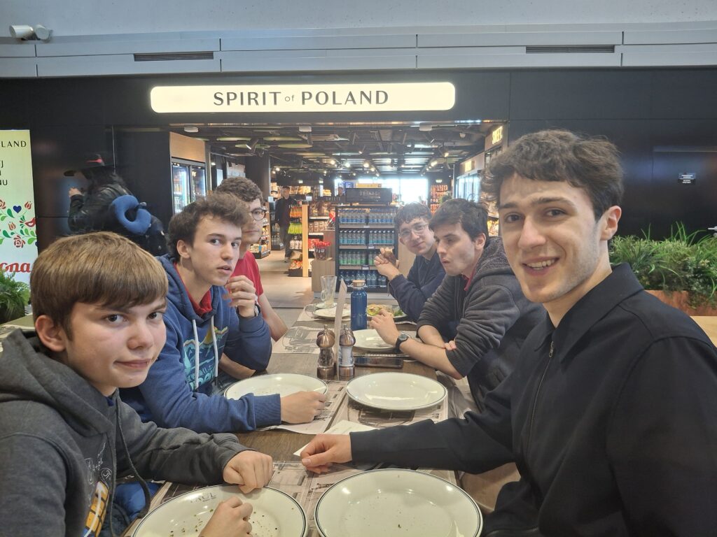À l’aéroport de Varsovie nous retrouvons comme prévu Antoine et Mattéo venus depuis Lyon avec leurs propres péripéties (ils auraient été témoins d’un homme essayant de faire passer une perceuse à la sécurité, persuadé qu’il s’agissait d’un arrosoir) et nous déjeunons des sandwichs dans un restaurant local appelé “Paul”.